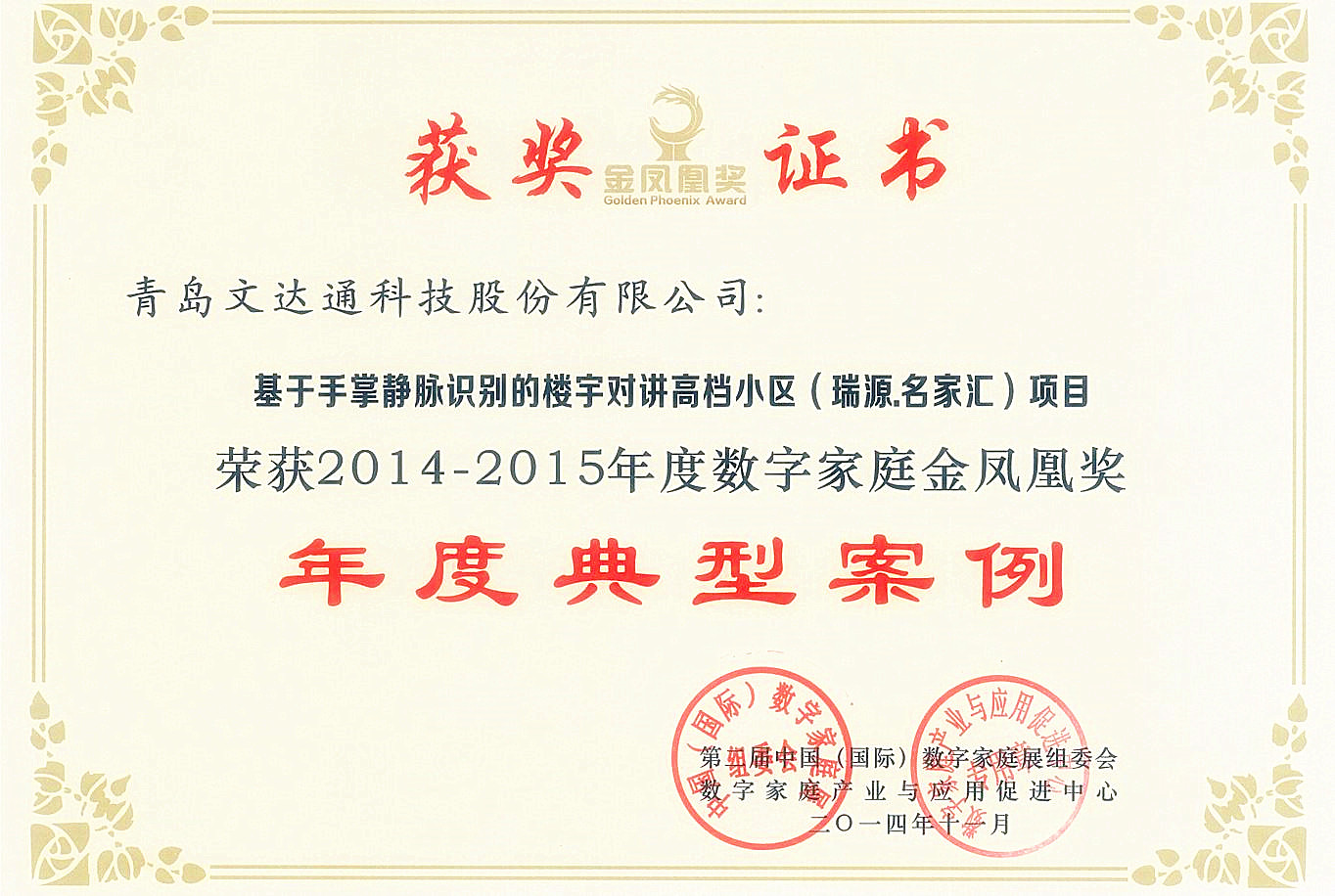 此次展会,太阳集团tyc4633基于互联网技术的楼宇对讲系统荣获2014年数字家庭展“金凤凰”年度创新产品奖,太阳集团tyc4633基于手掌静脉识别的楼宇对讲高档小区-瑞源.名家汇项目荣获2014年数字家庭展“金凤凰”年度典型案例奖。 期待下一次的辉煌!